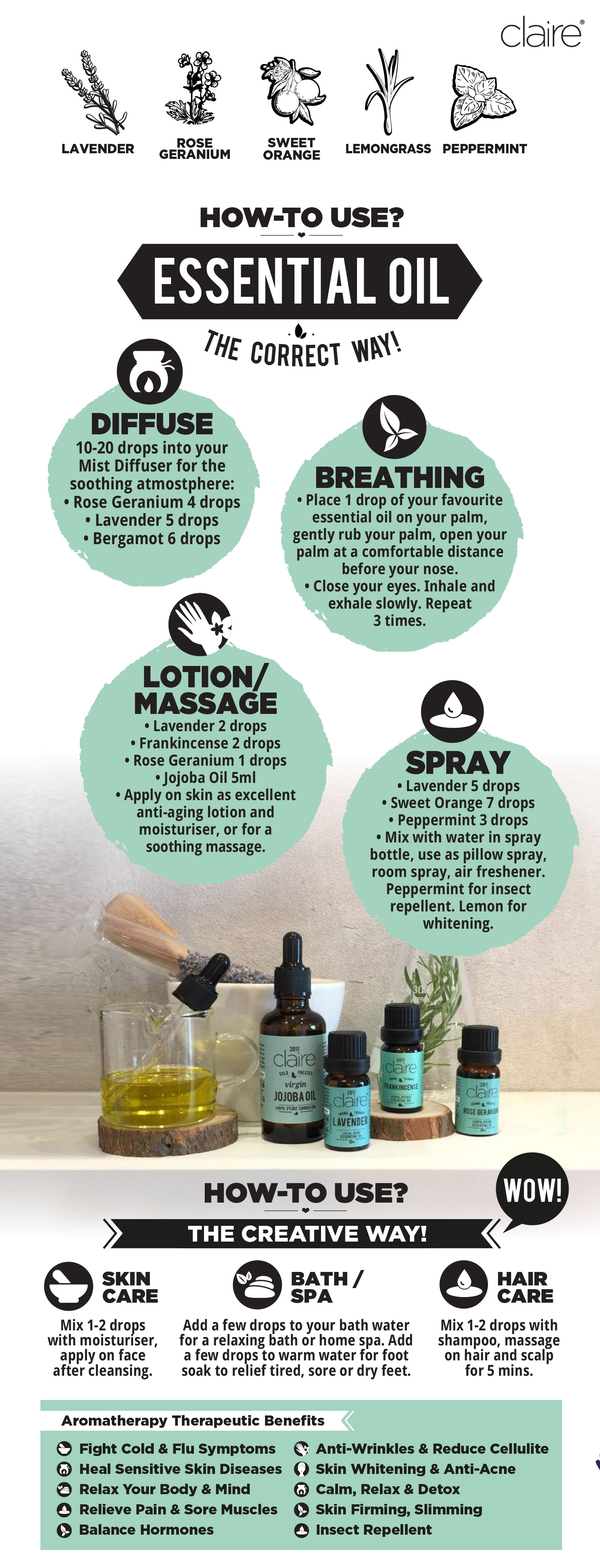 • Place 1 drop of your favourite essential oil on your palm, gently rub your palm and open your palm at a comfortable distance before your nose.